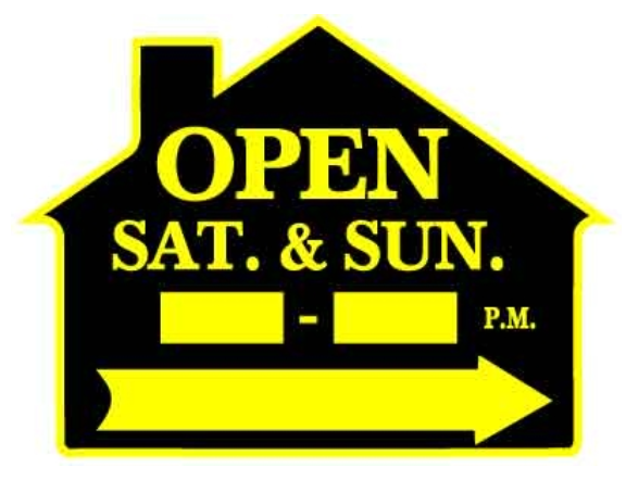 Corrugated Black & Yellow House Shape Open Sat. & Sun. __-__ P.M. w/Arrow Sign - $8.00